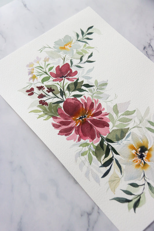 Floral Crescent with Maroon & White flowers Watercolor Fine Art Print