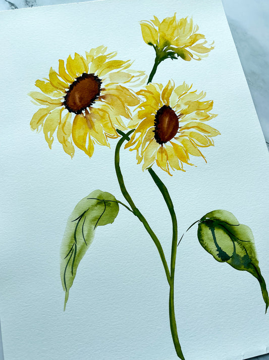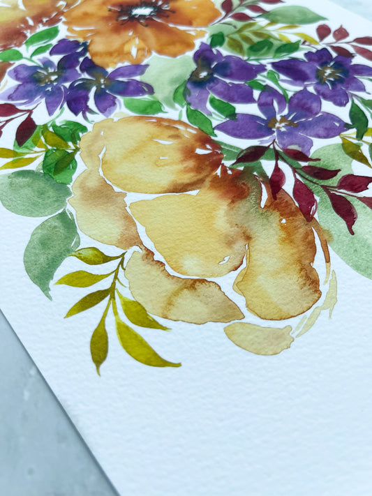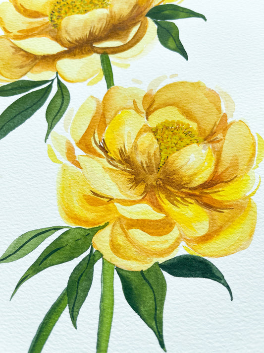 Ochre Yellow Peonies with Purple filler flowers Watercolor Fine Art Print