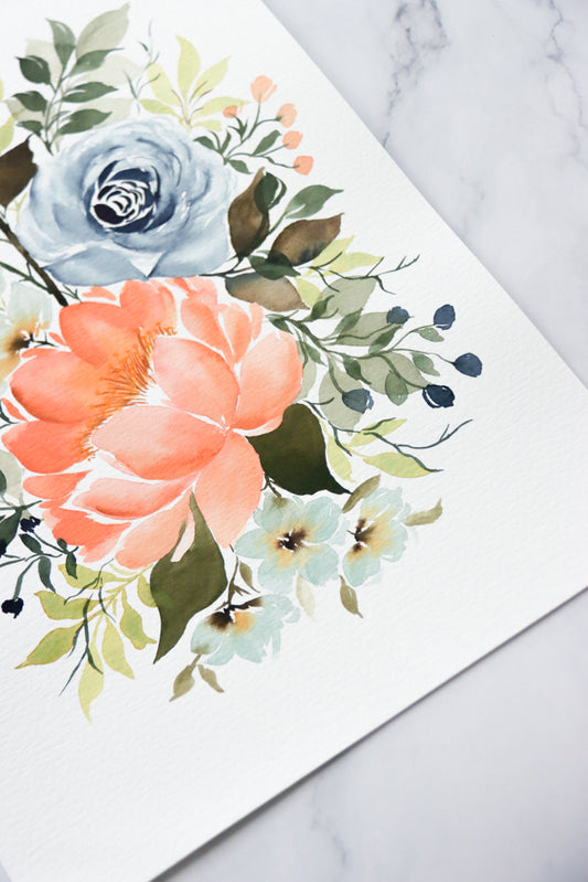 Peach Peony & Indigo Floral Arrangement Watercolor Fine Art Print