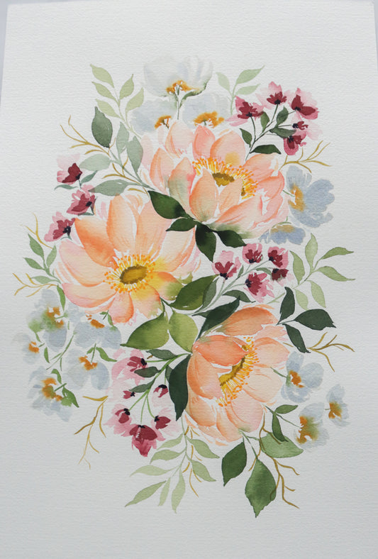 Peach Peonies Floral Arrangement Watercolor Fine Art Print