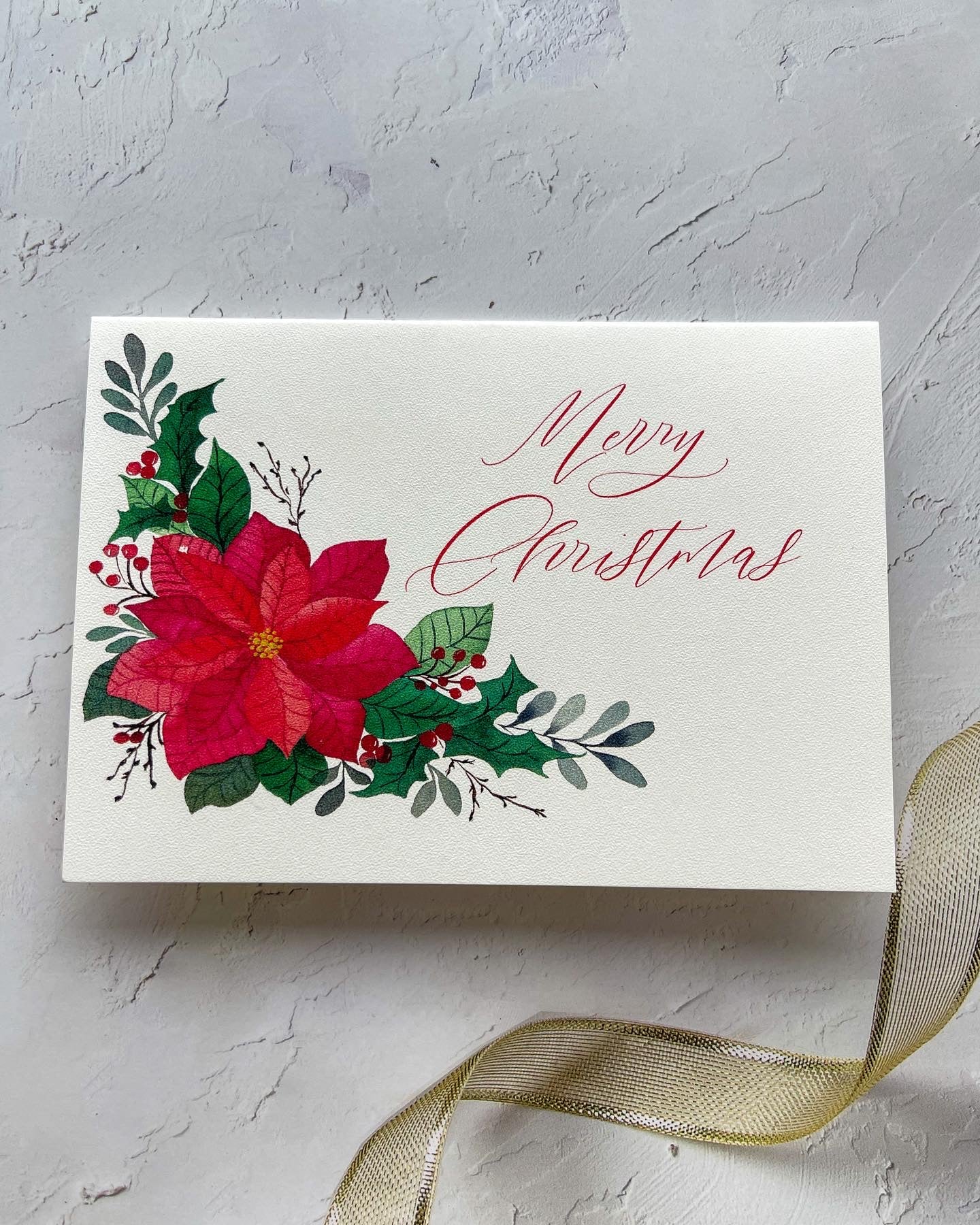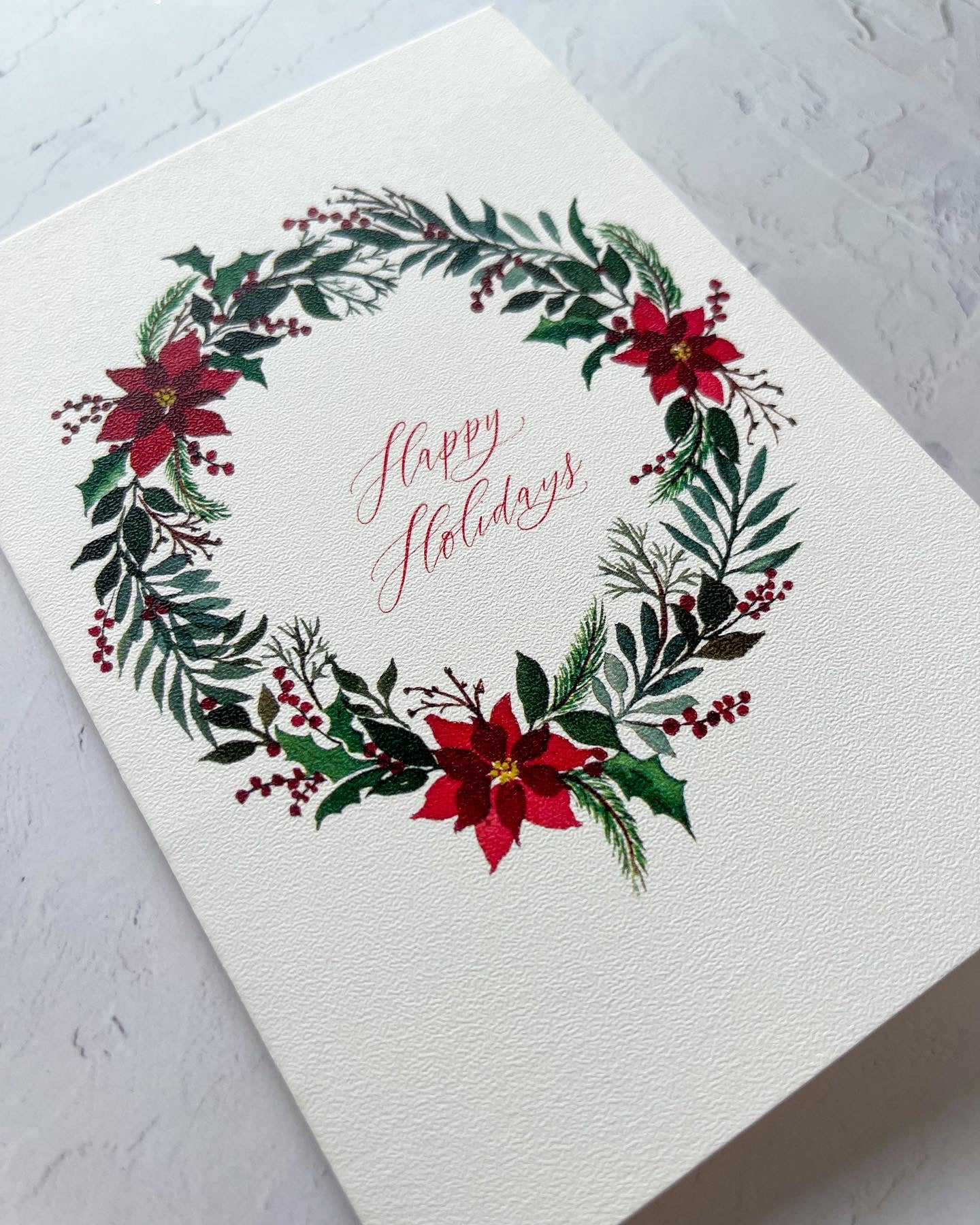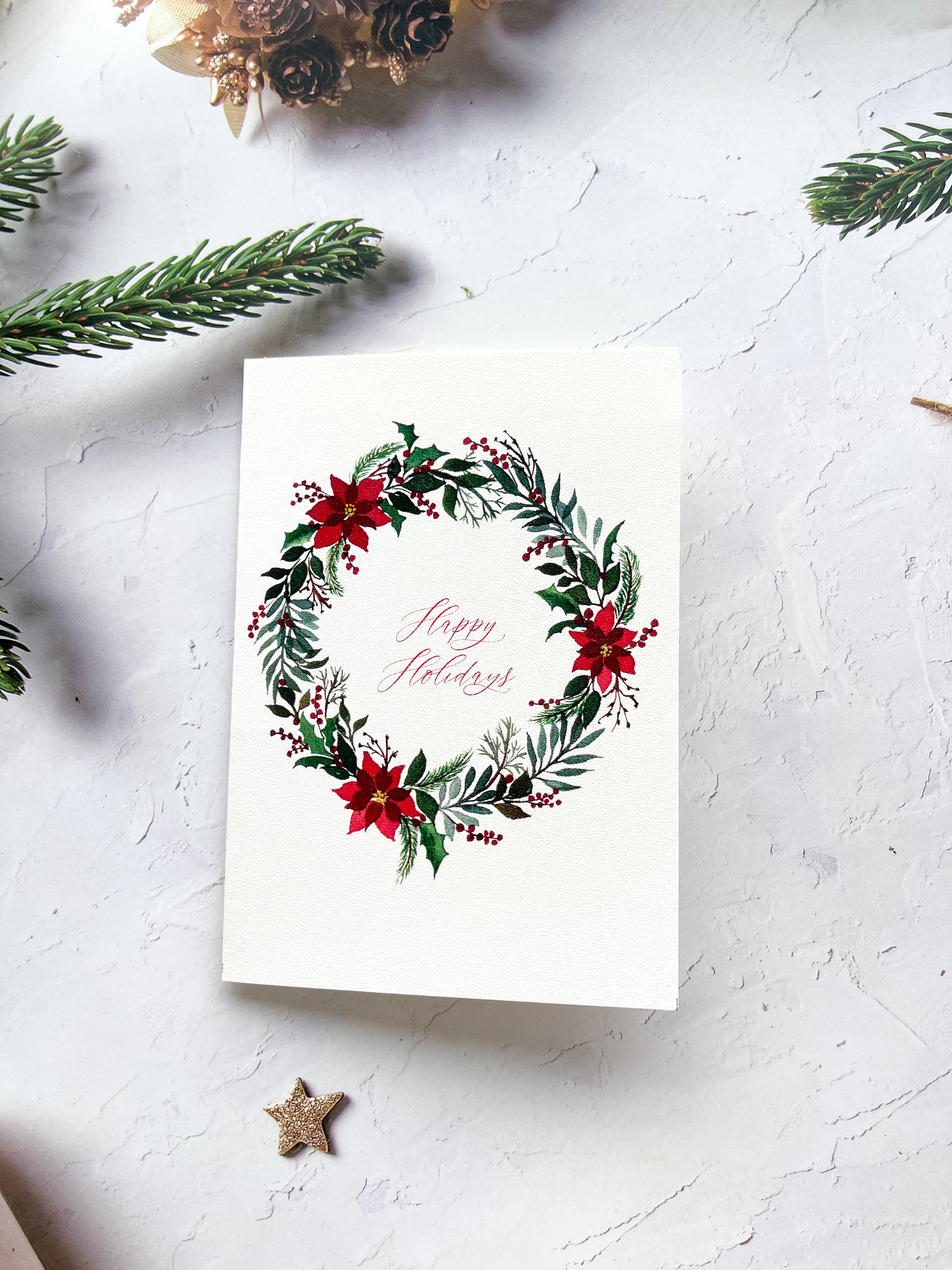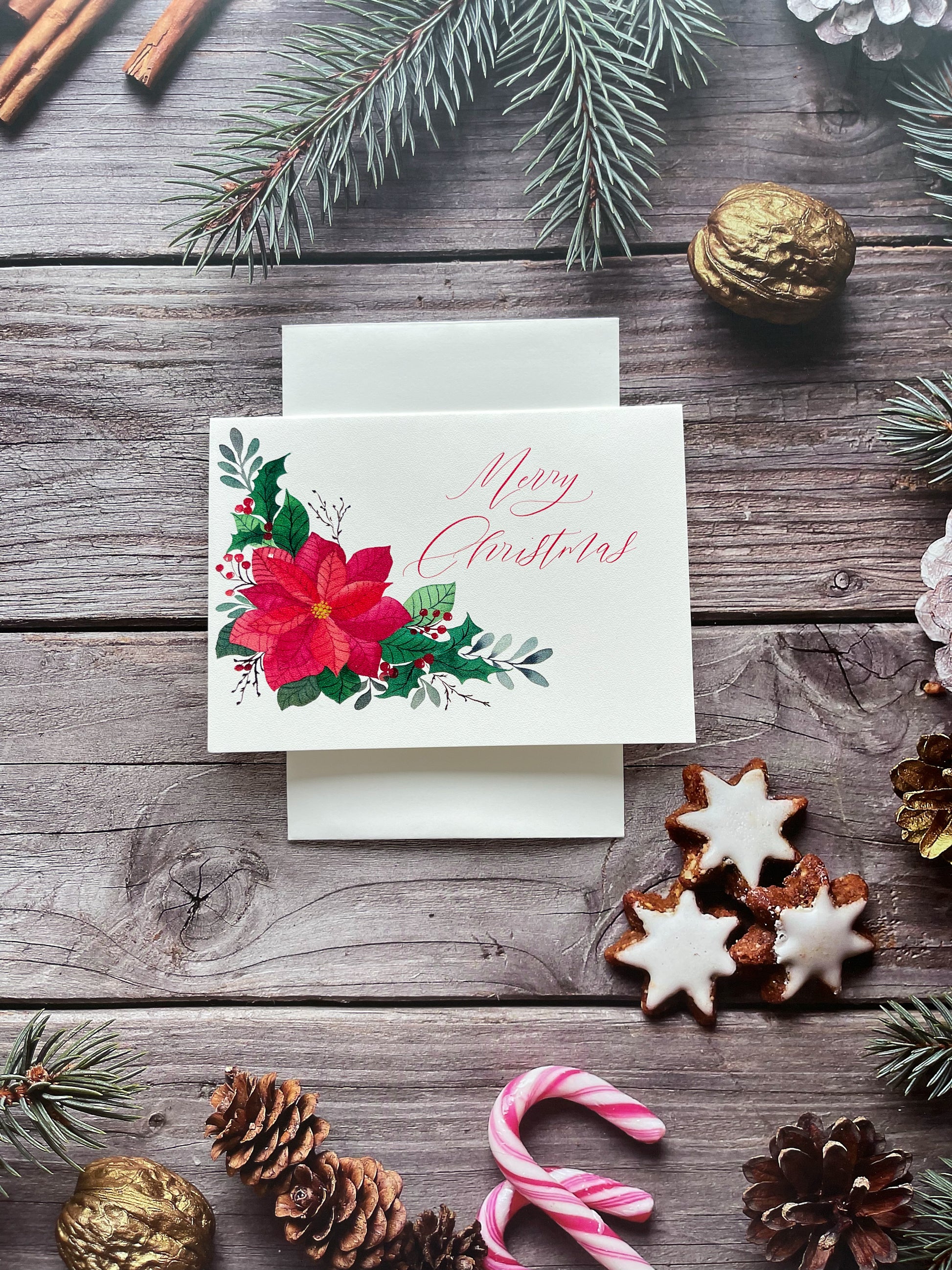 - Poinsettia Wreath with Winter Foliage: Adorned with a festive Poinsettia wreath and a heartfelt Christmas wish.