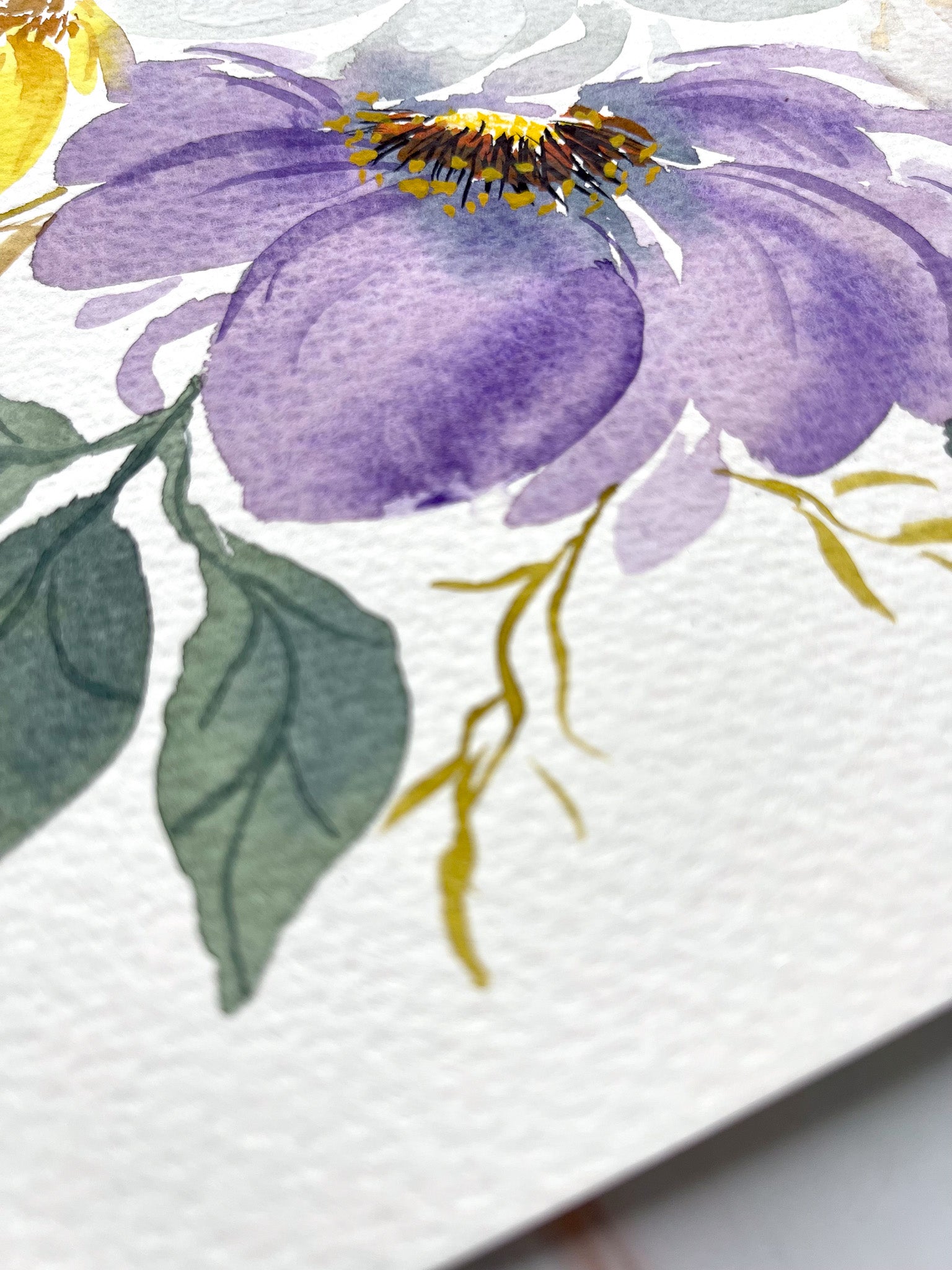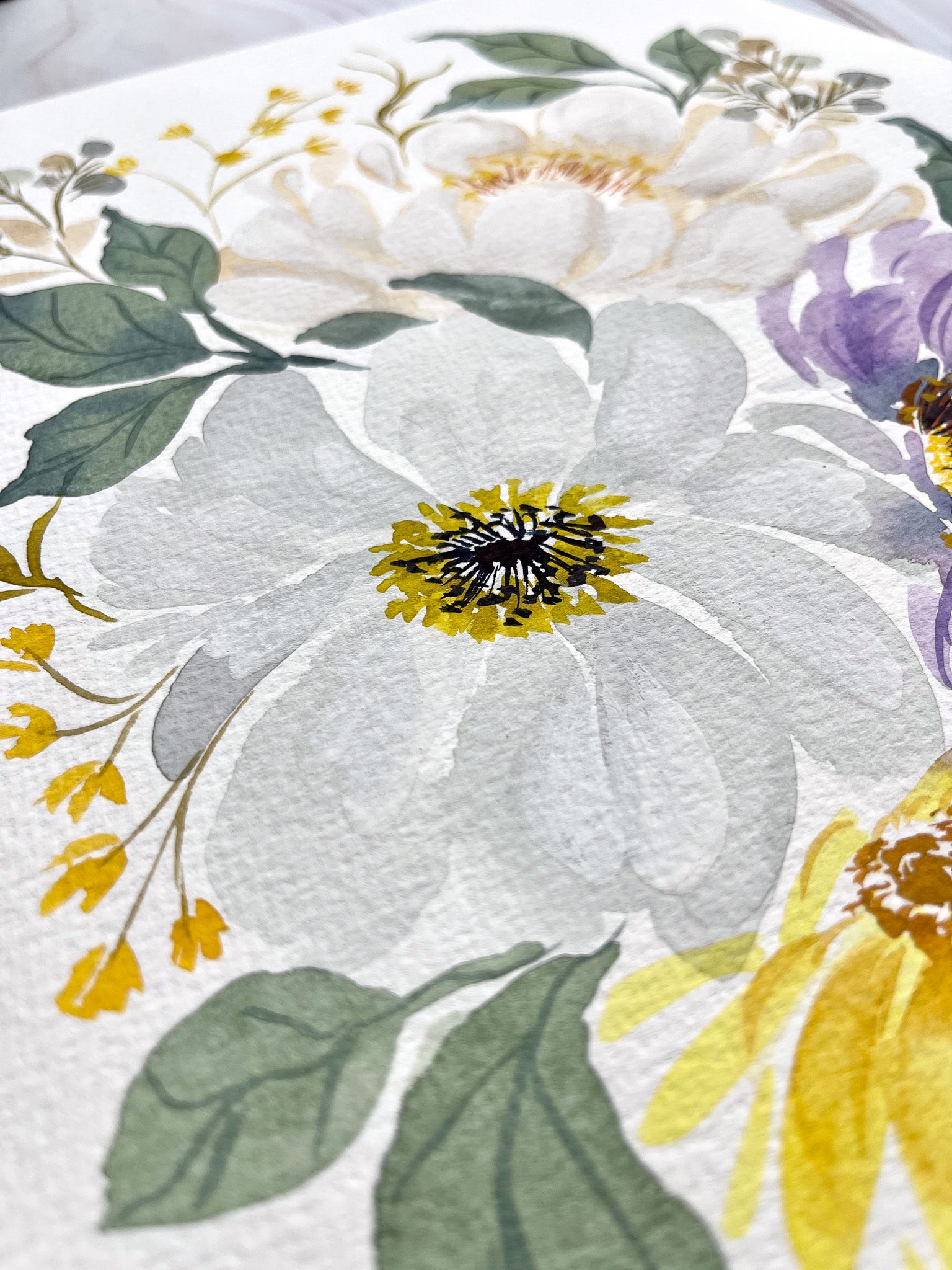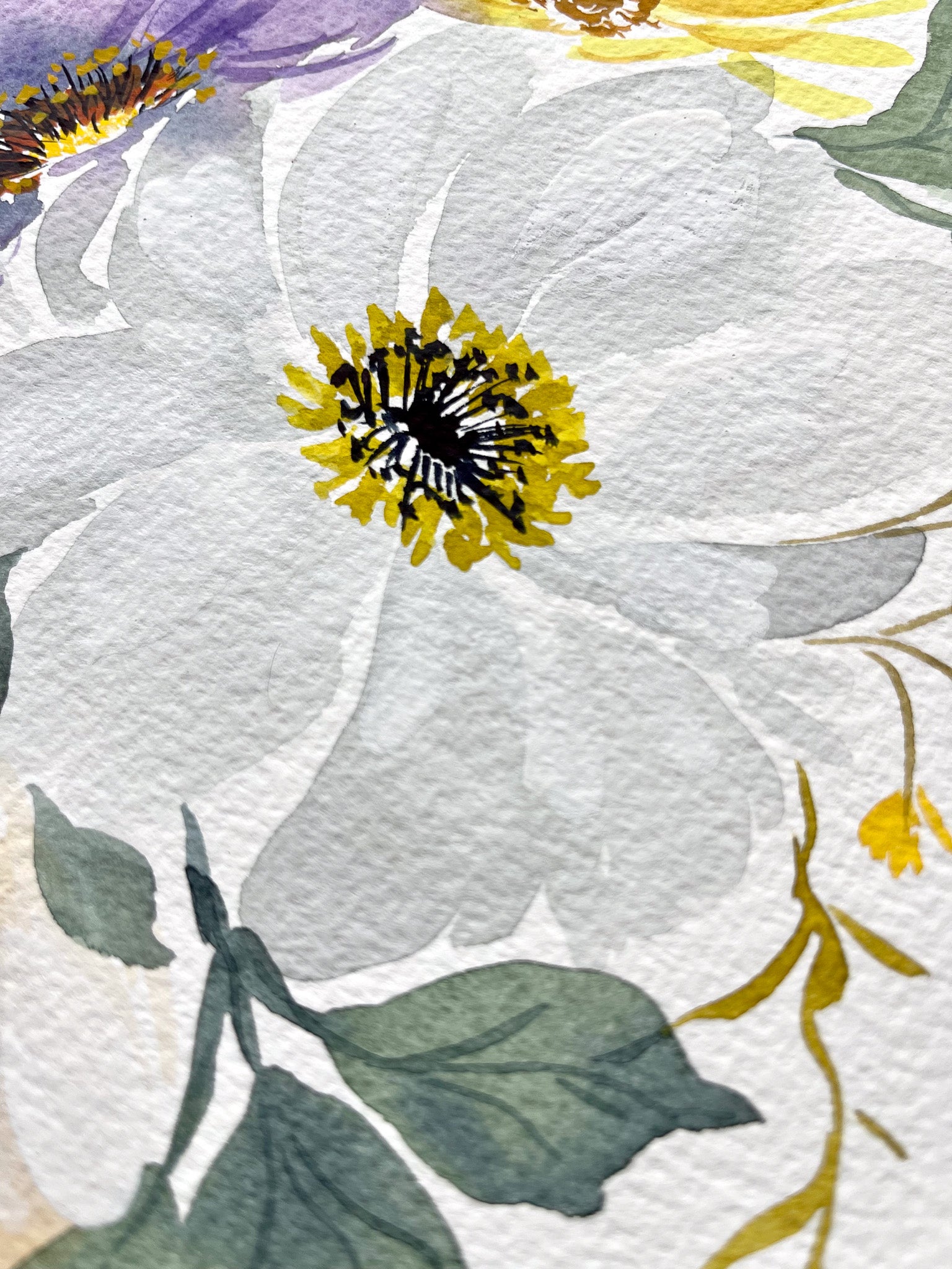 Indulge in the captivating beauty of this watercolor Fine Art Print, an absolute masterpiece that showcases the delicate softness of wispy white flowers, accompanied by charming yellow and purple ones as well. This floral arrangement is elegantly painted with watercolor and gouache, giving it a stunning visual appeal that can be appreciated for years to come.