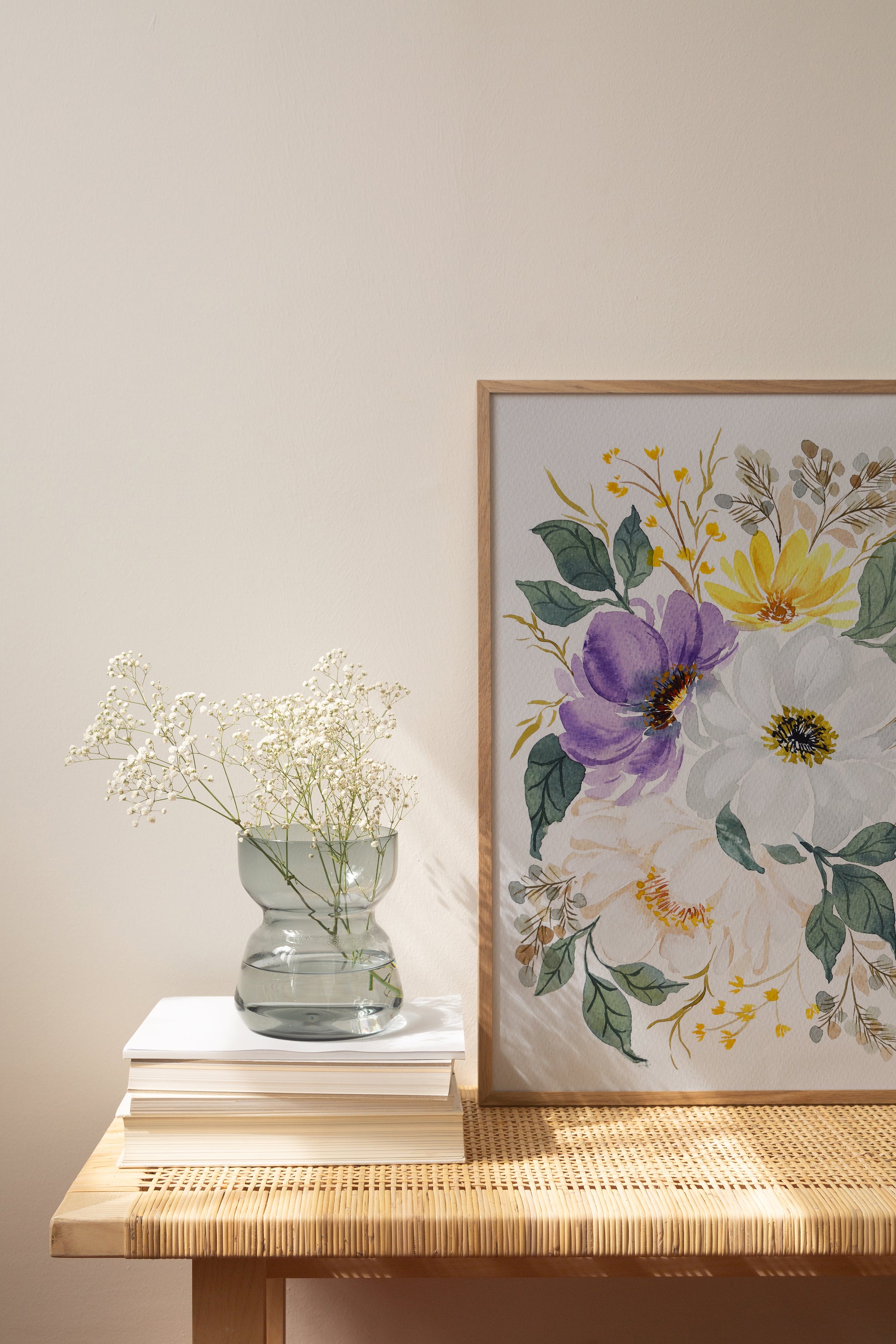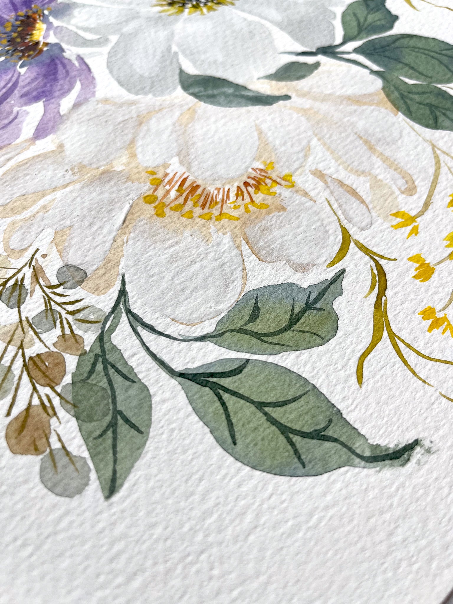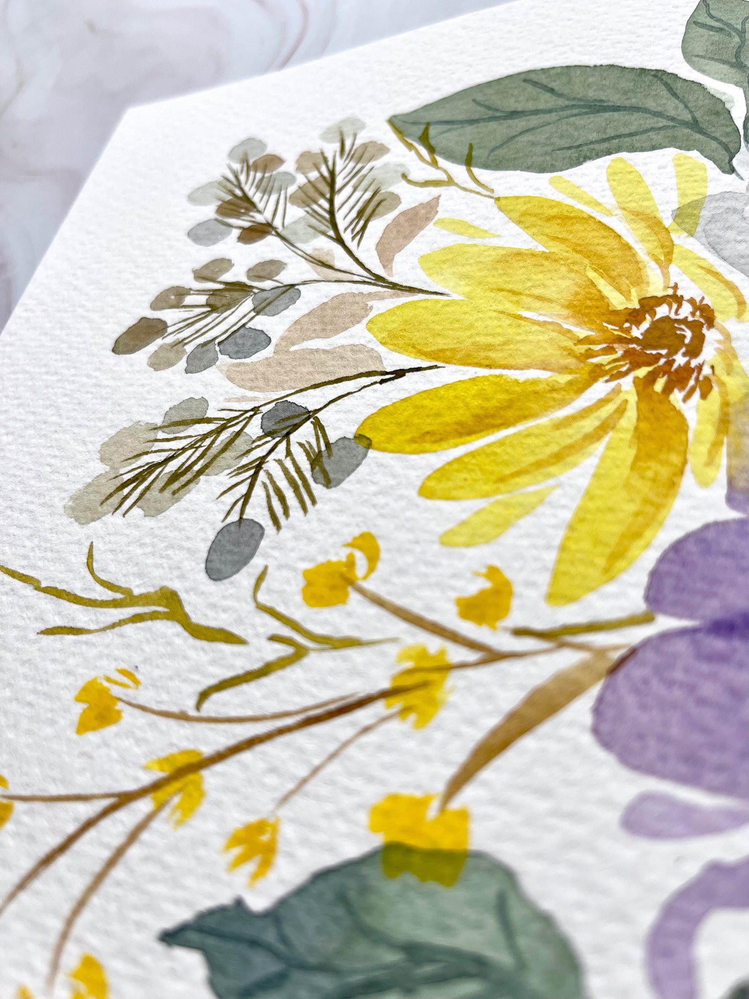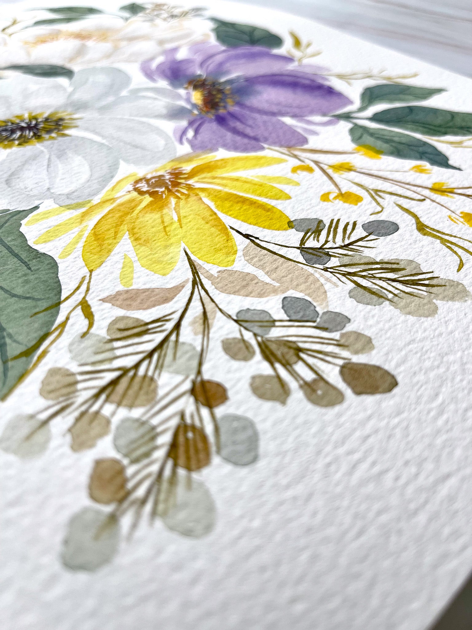 Indulge in the captivating beauty of this watercolor Fine Art Print, an absolute masterpiece that showcases the delicate softness of wispy white flowers, accompanied by charming yellow and purple ones as well. This floral arrangement is elegantly painted with watercolor and gouache, giving it a stunning visual appeal that can be appreciated for years to come.