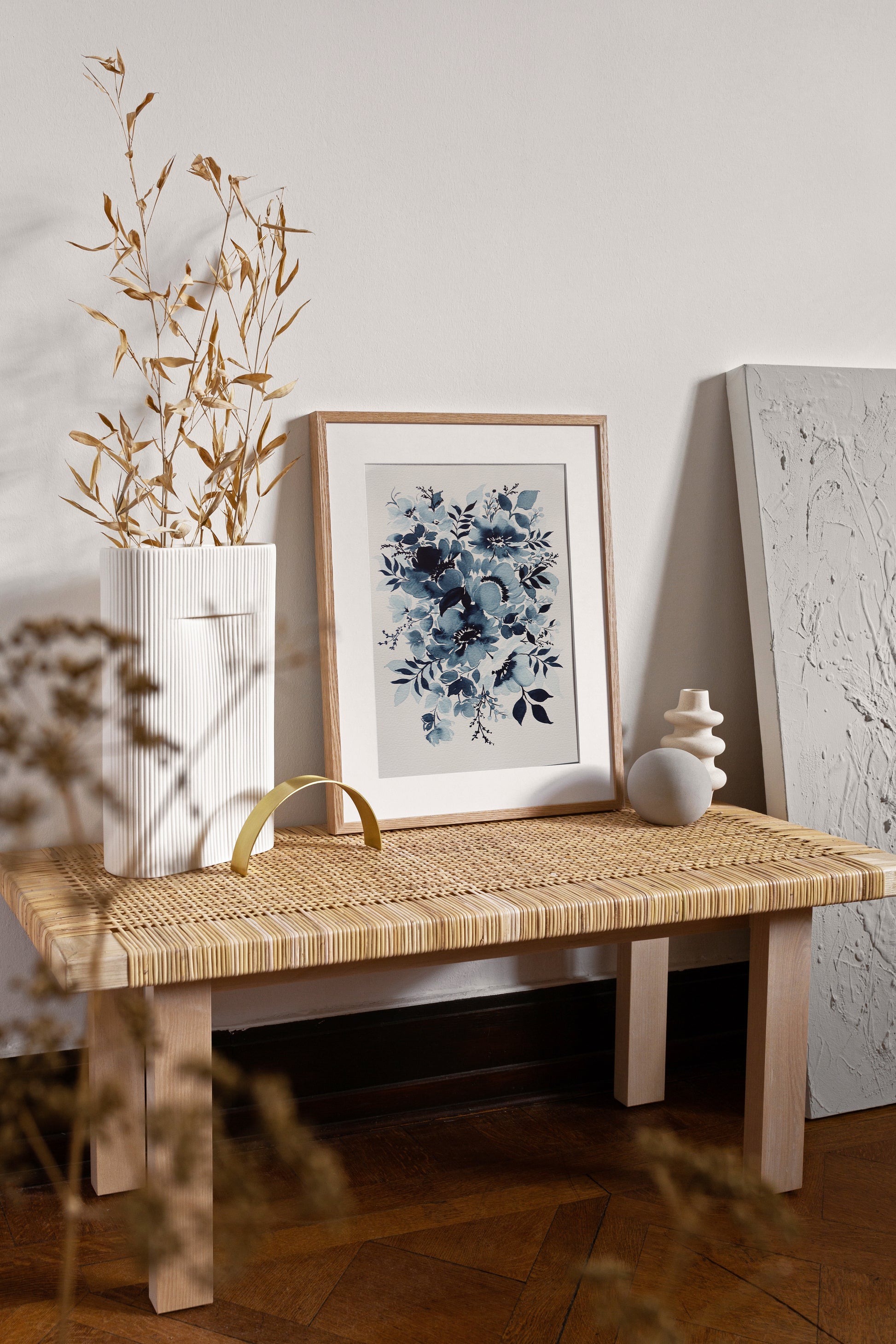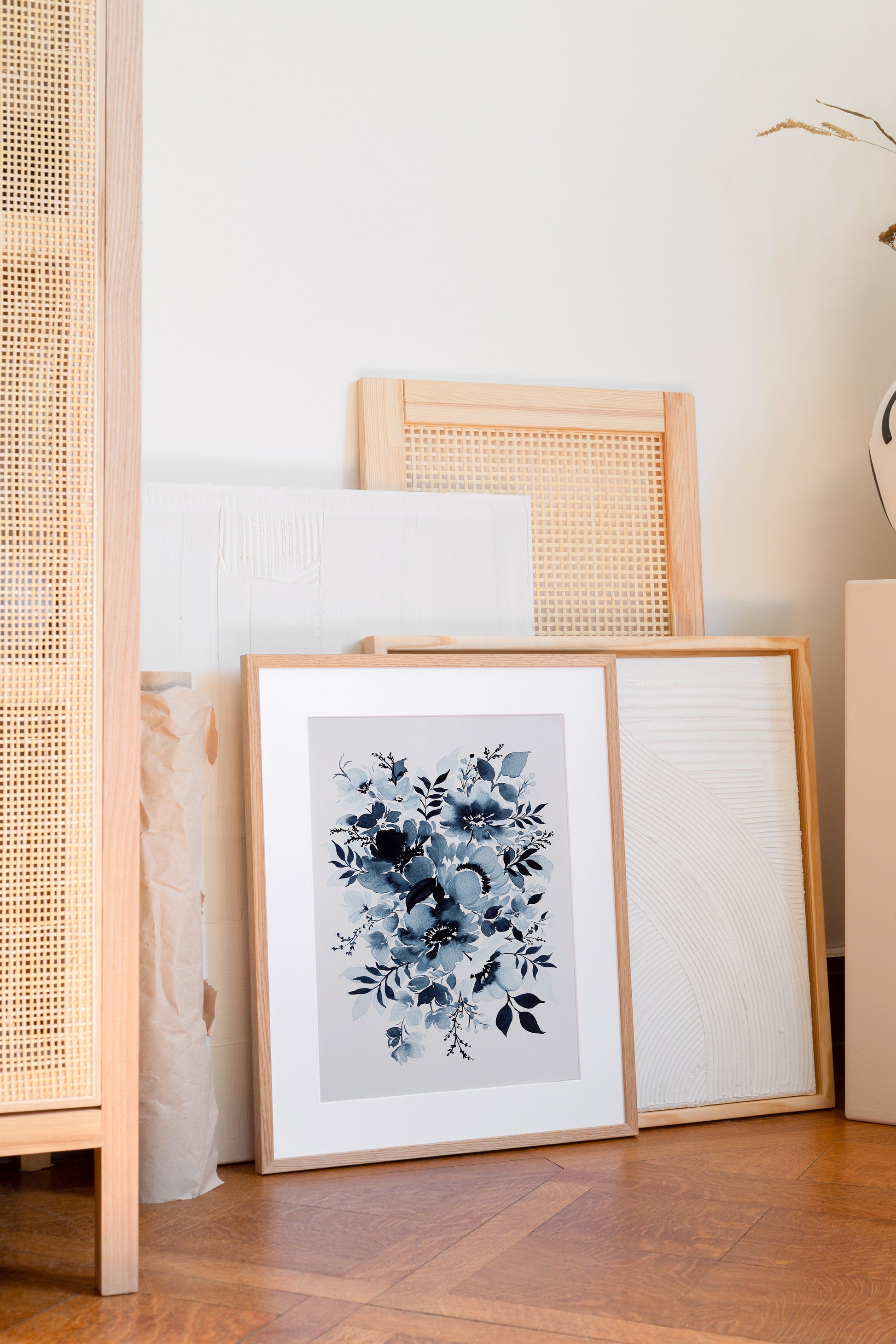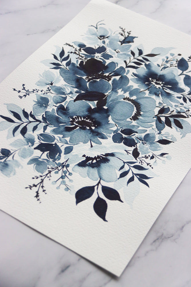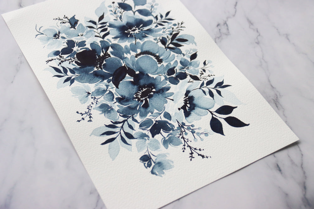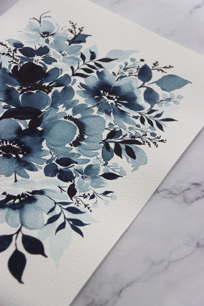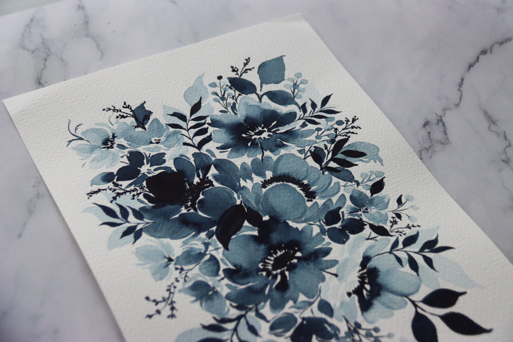 This original watercolor floral painting (size 26 x 38 cm), showcases a stunning arrangement of soft florals in monochrome. The complementary indigo colors of the flowers create a soothing and moody ambiance that would be perfect for any room in your home.