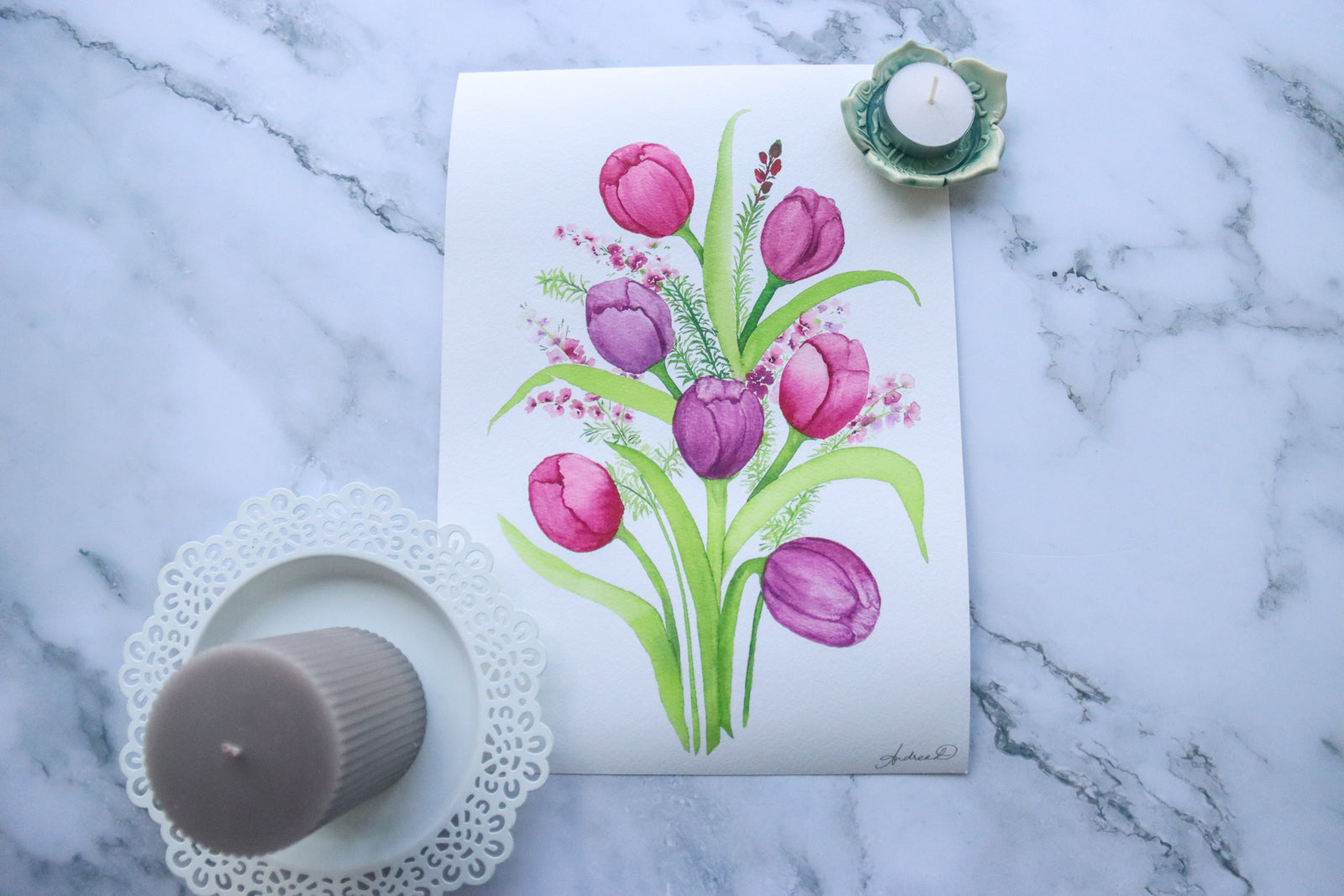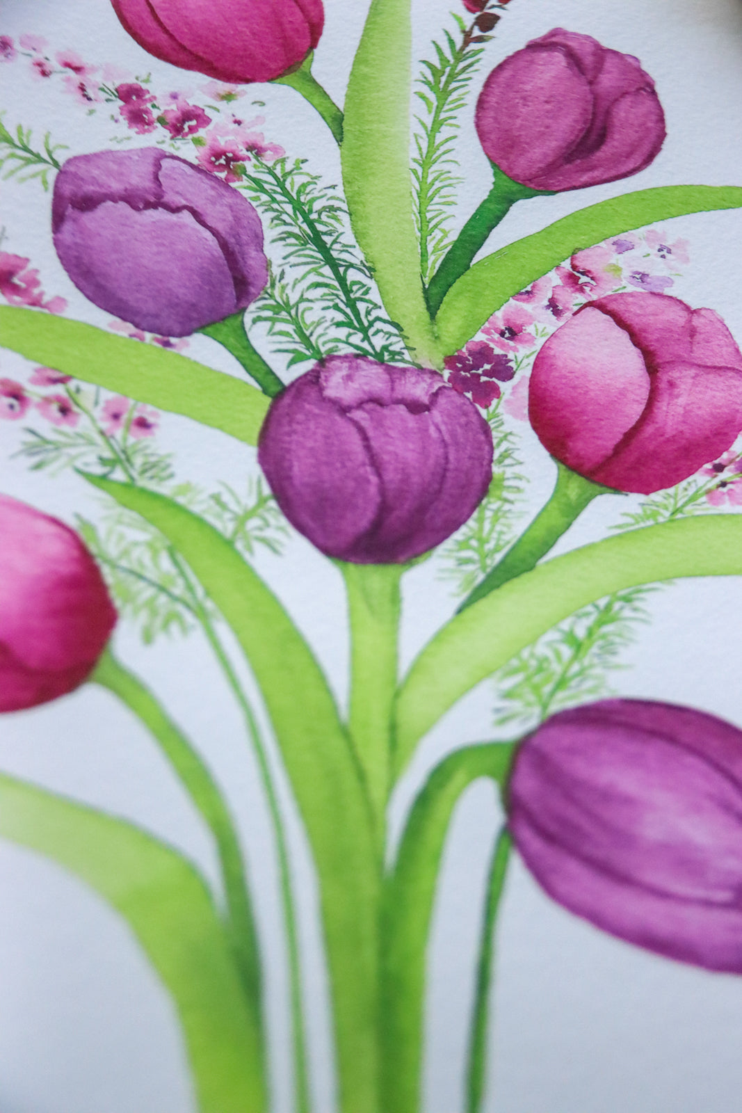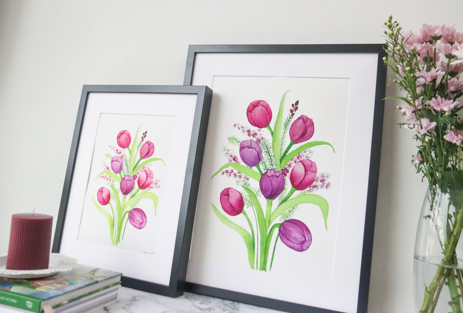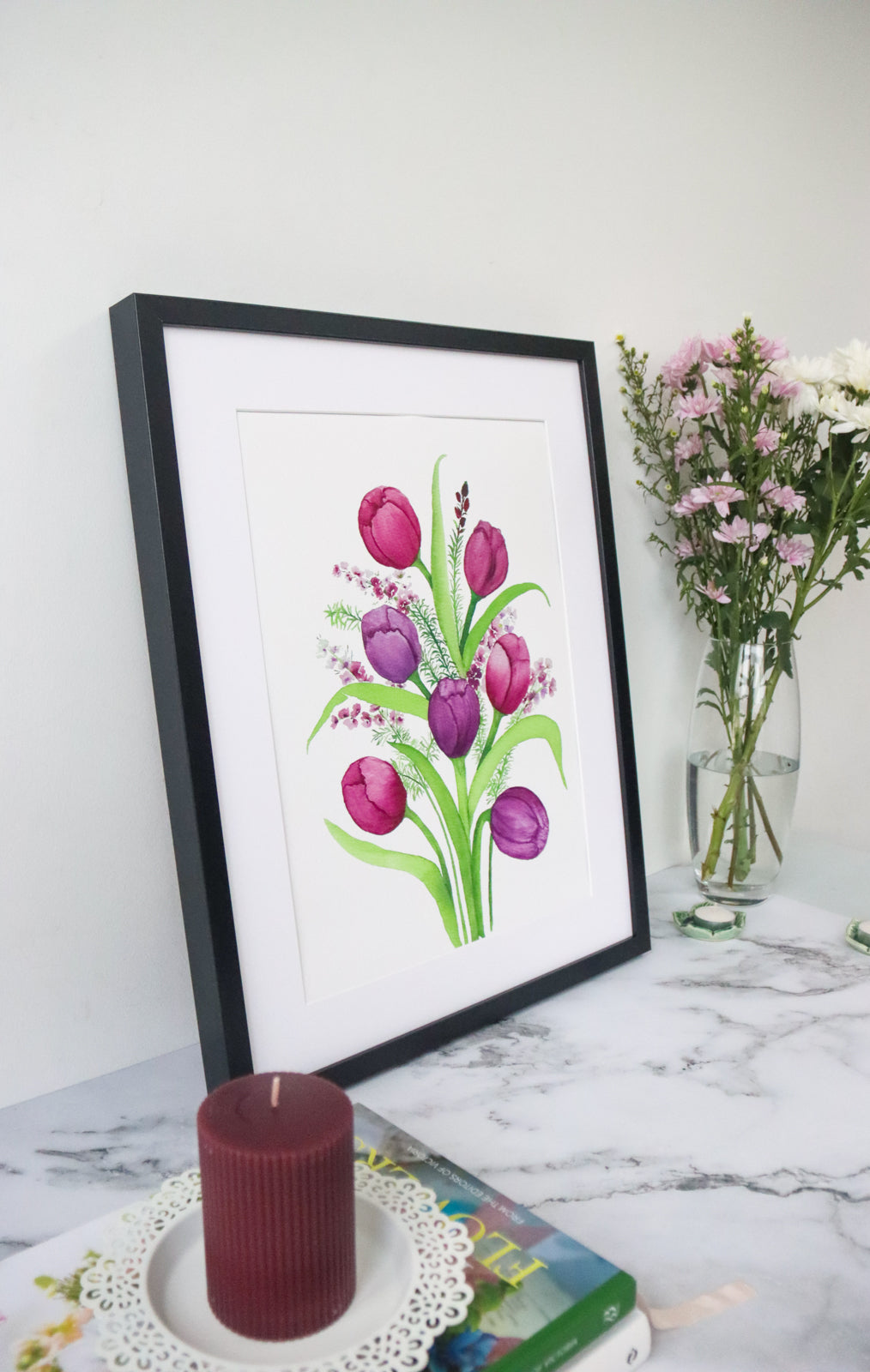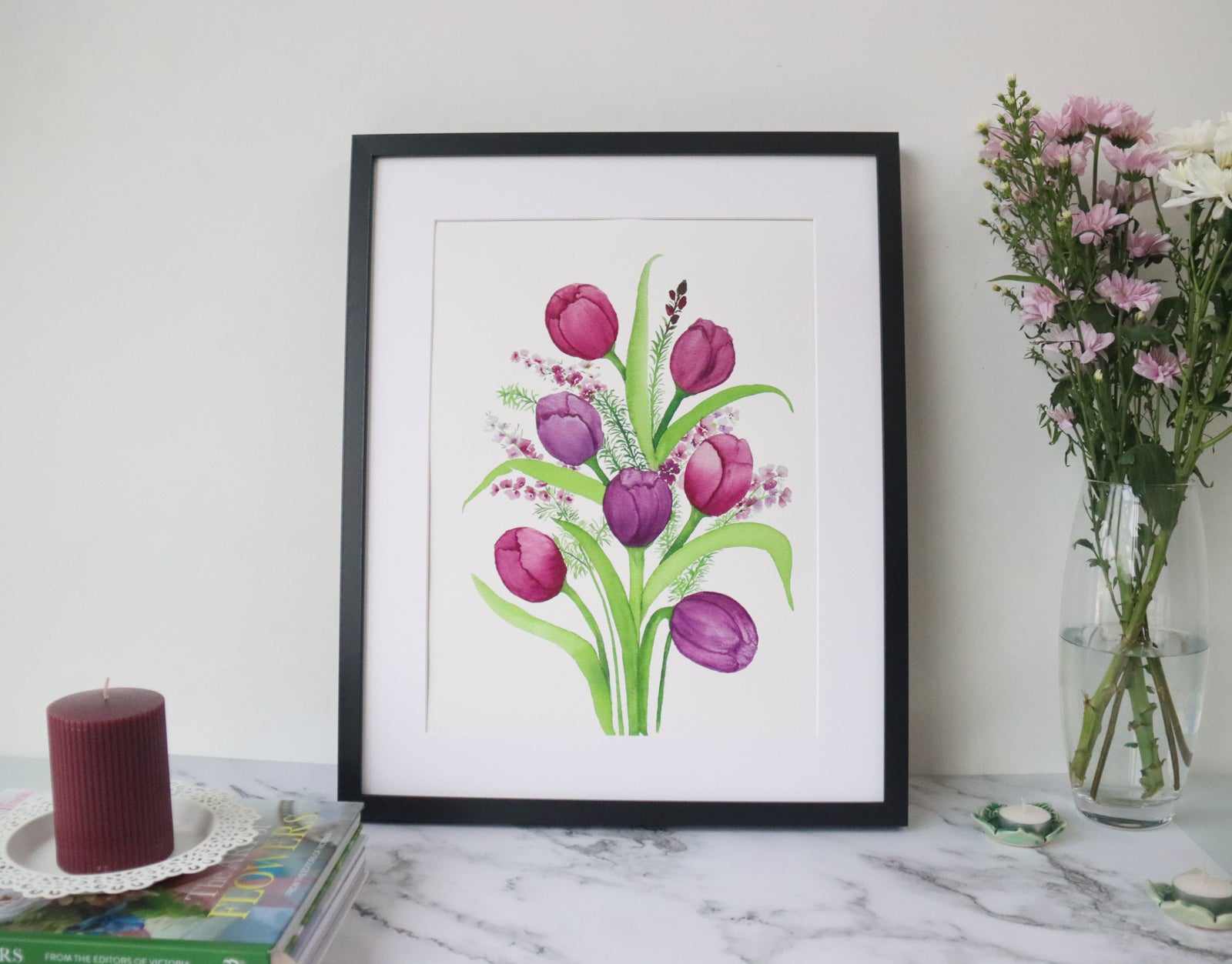 Indulge in the sheer elegance and detail of this beautiful Fine Art Print of Pink and Purple tulips, a masterpiece that brings the captivating allure of nature right to your walls. Each brushstroke is meticulously rendered on museum-grade 310 gsm textured paper, making it virtually impossible to distinguish from the original painting. This artwork was inspired by a fresh arrangement of tulips, printed in Singapore, this digitally signed piece of art is available in both A3 and A4 sizes, ensuring it fits perfectly within your desired space.