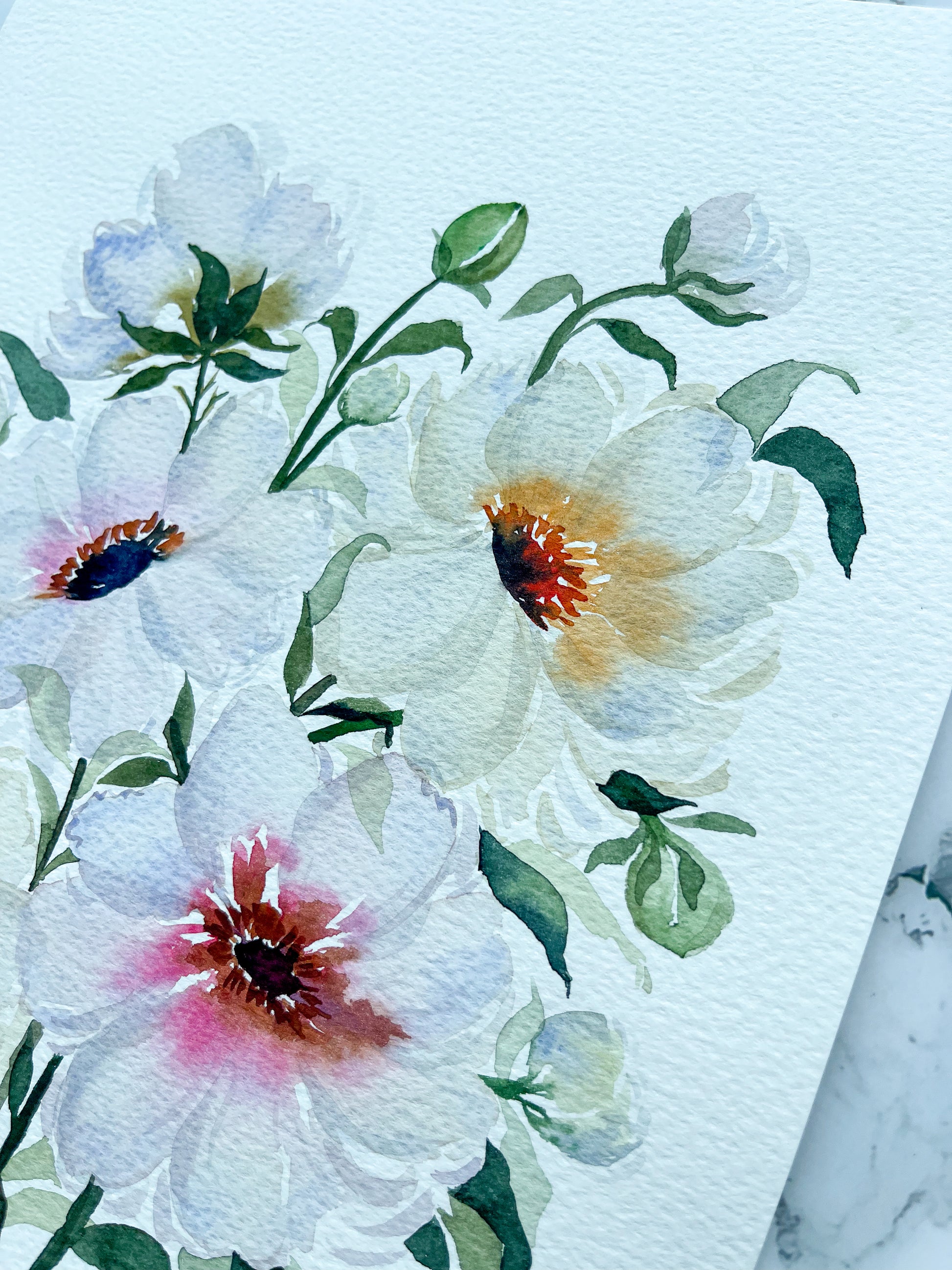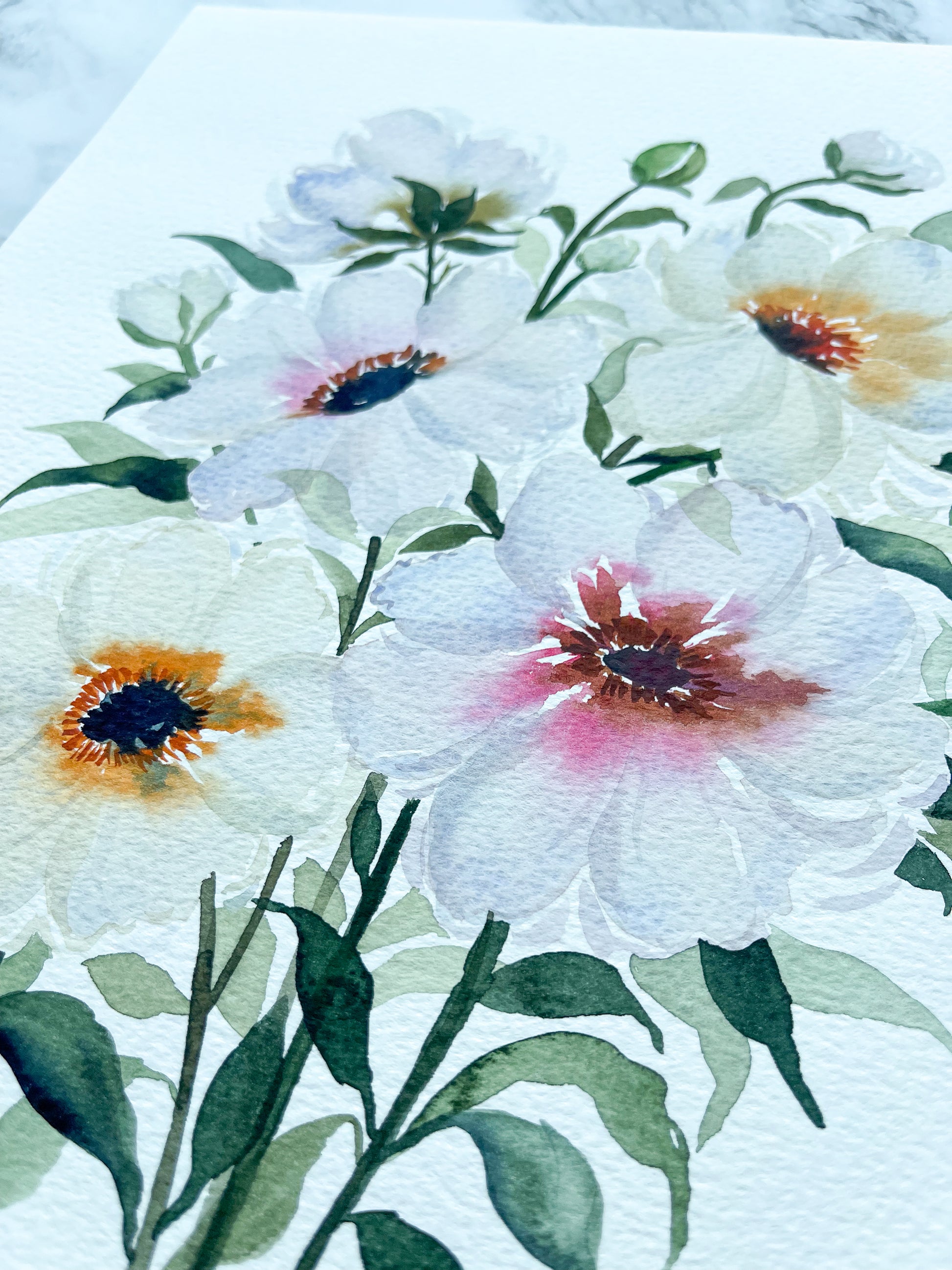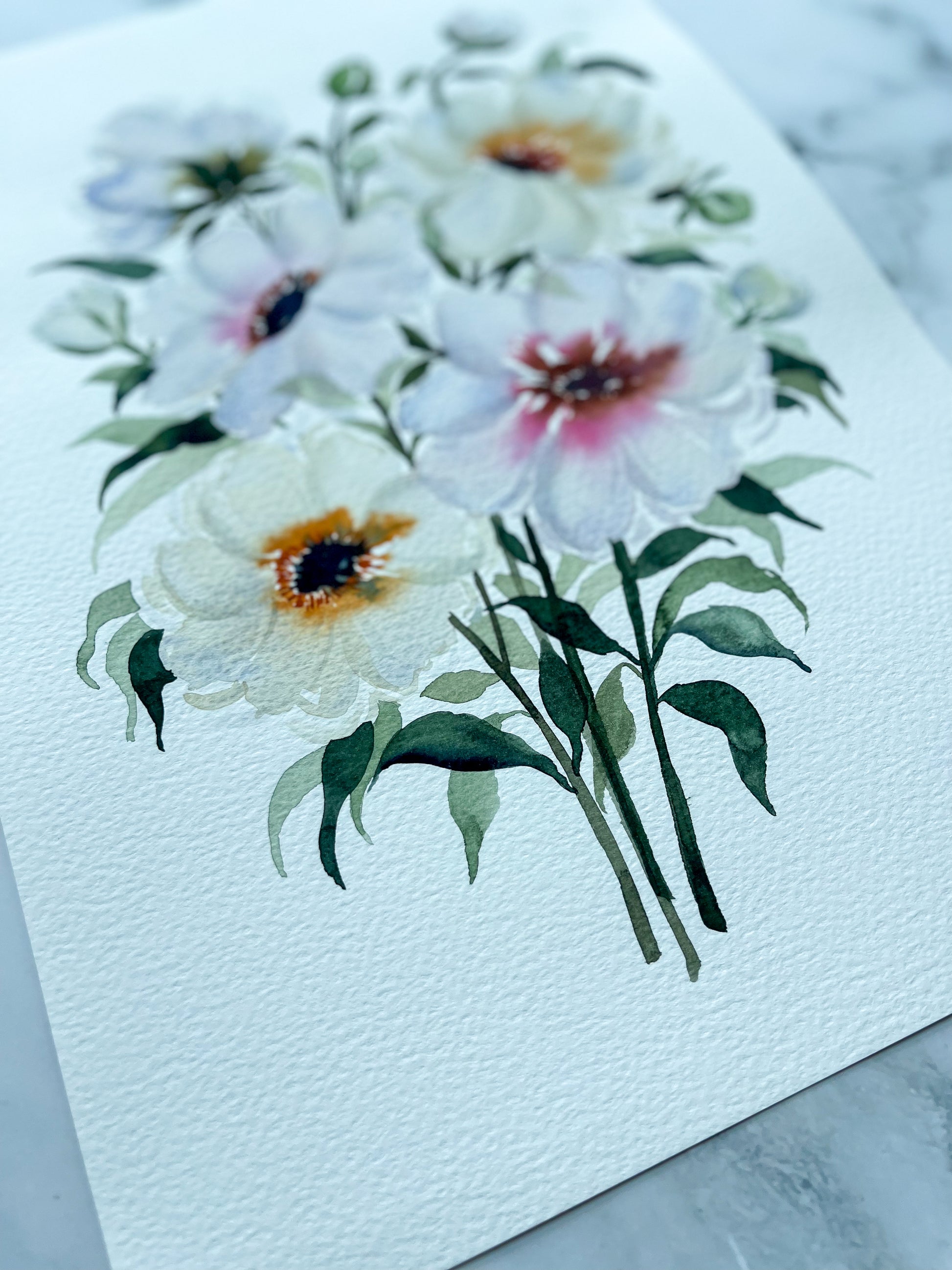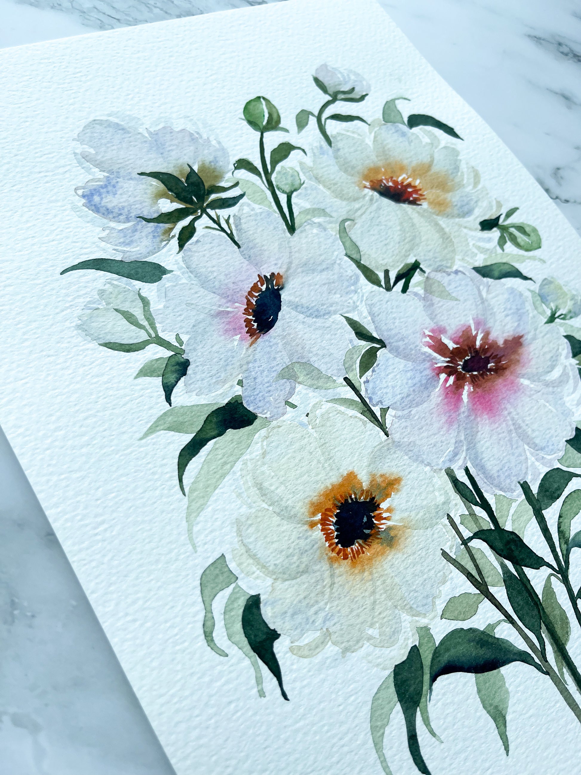 Immerse yourself in the tranquility and beauty of this one-of-a-kind watercolor floral original artwork. Delicate and wispy white flowers float effortlessly amidst lush green leaves and stems, creating a calming and soothing atmosphere. The soft and fluffy textures of this piece will transport you to a serene and peaceful place.