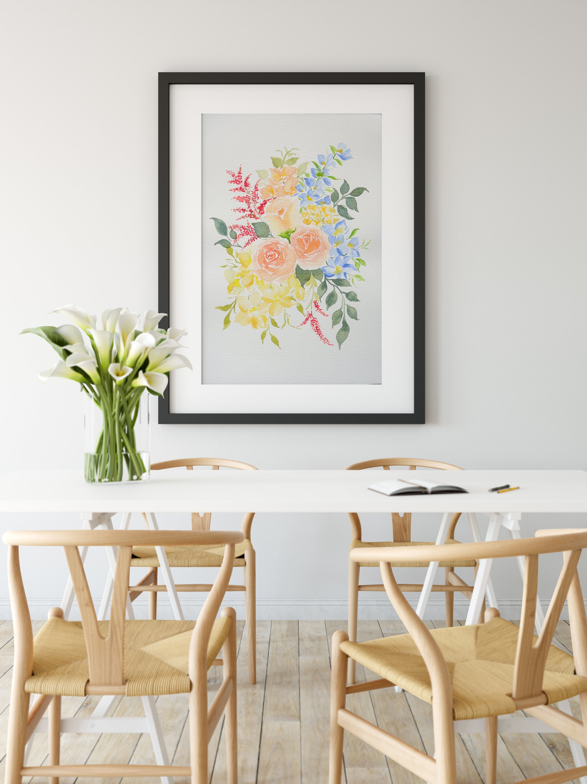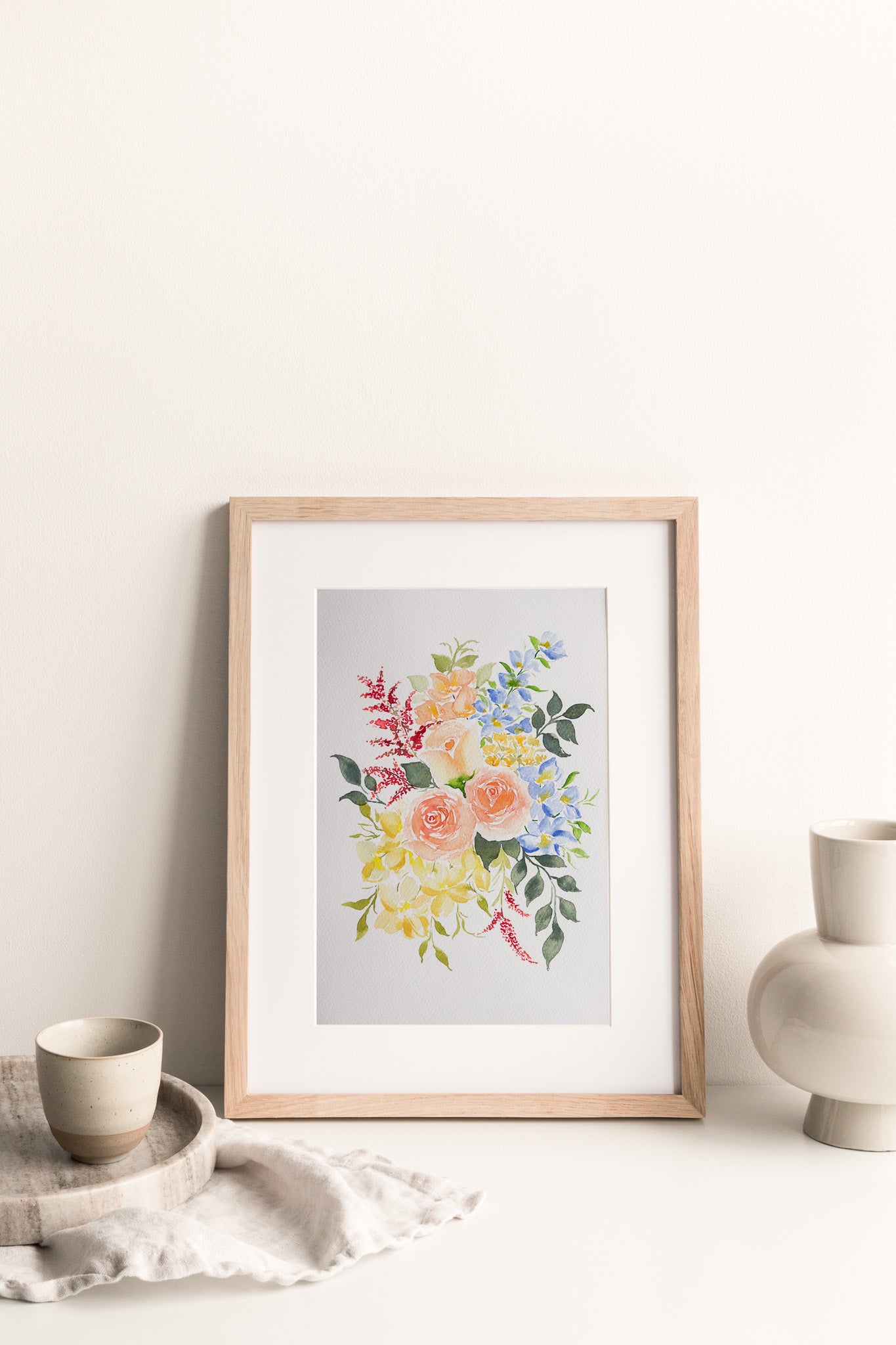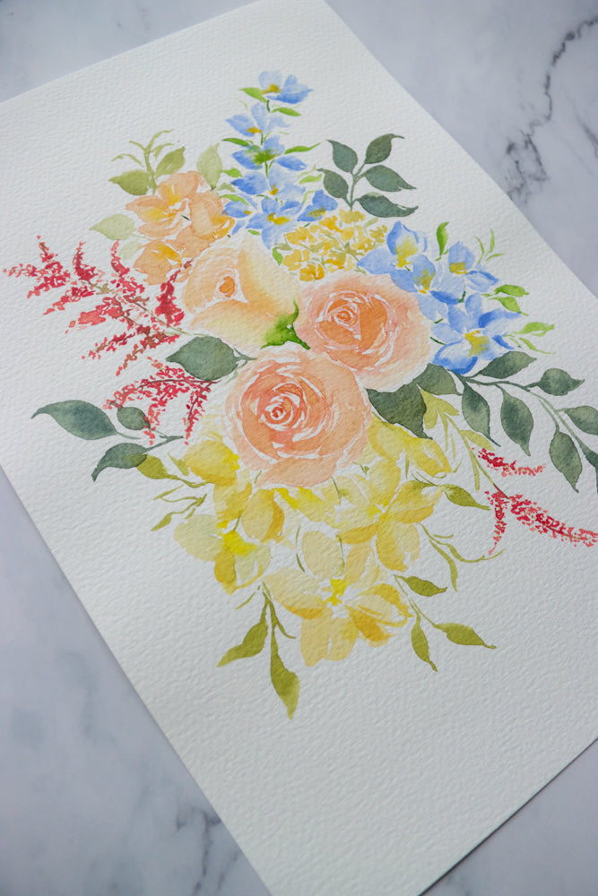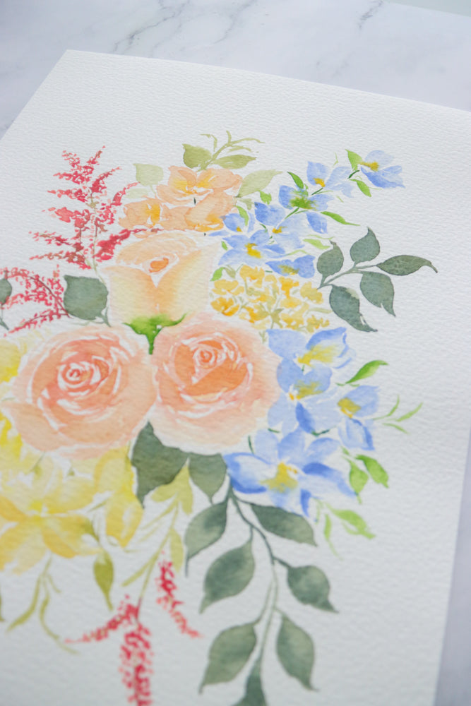 This unique original watercolor painting captures the essence of spring with its soft, pastel-colored floral arrangement. Each stroke of the brush has been meticulously crafted on 100% cotton, 300 gsm watercolor paper using professional-grade watercolor paints, resulting in a textured piece that exudes softness and brightness.