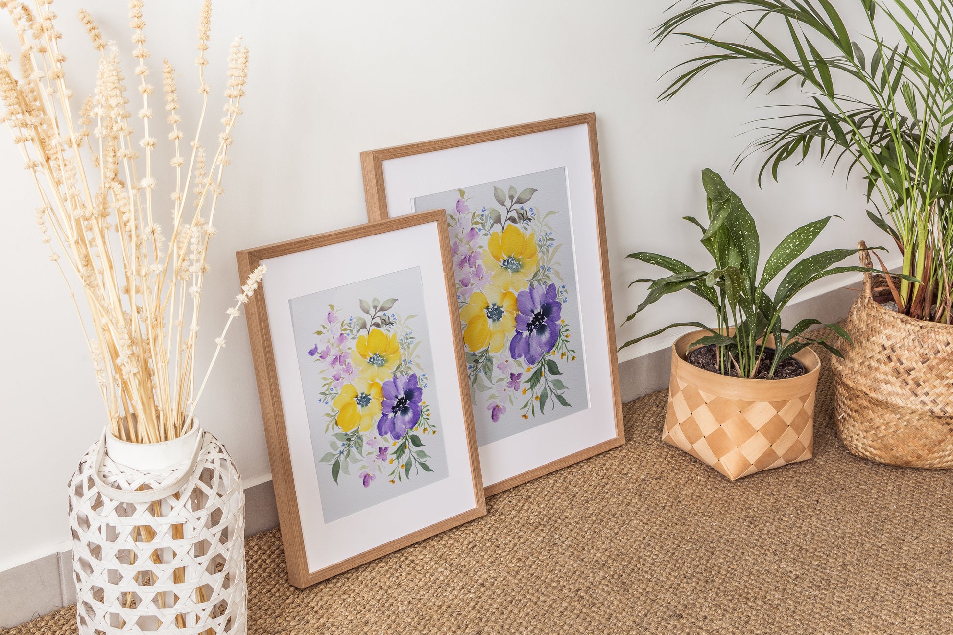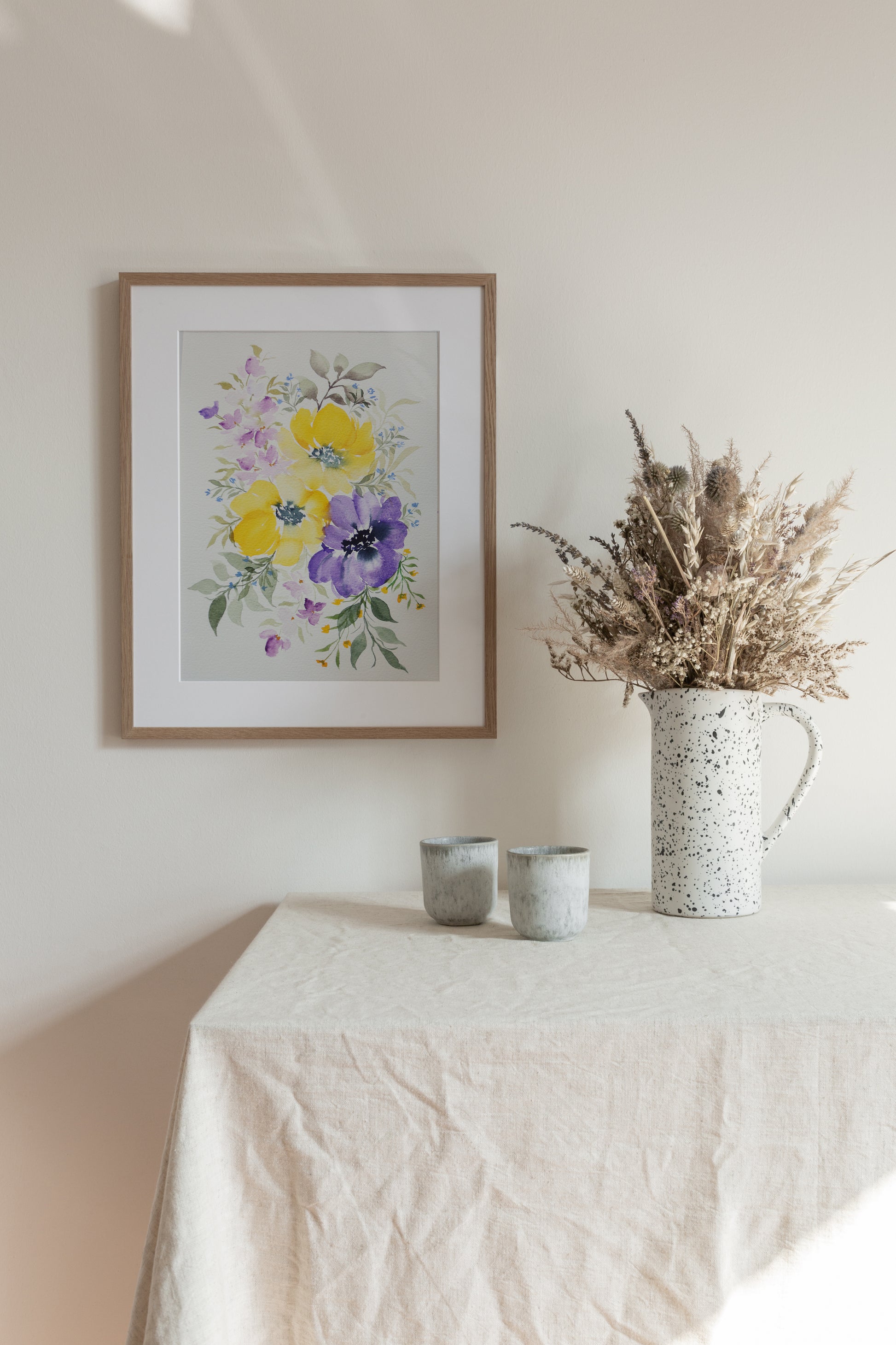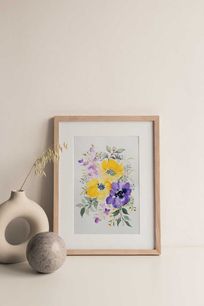 Capture the vibrant beauty of nature with this exquisite watercolor fine art print. Featuring a stunning floral arrangement of complementary colors, bright yellow and purple flowers, this print is available in two sizes - A3 (29.7 x 42 cm) and A4 (21 x 29.7 cm). The textured watercolor paper and archival inks used in printing ensure that this print will remain as vibrant and beautiful as the day it was made, for decades without fading.